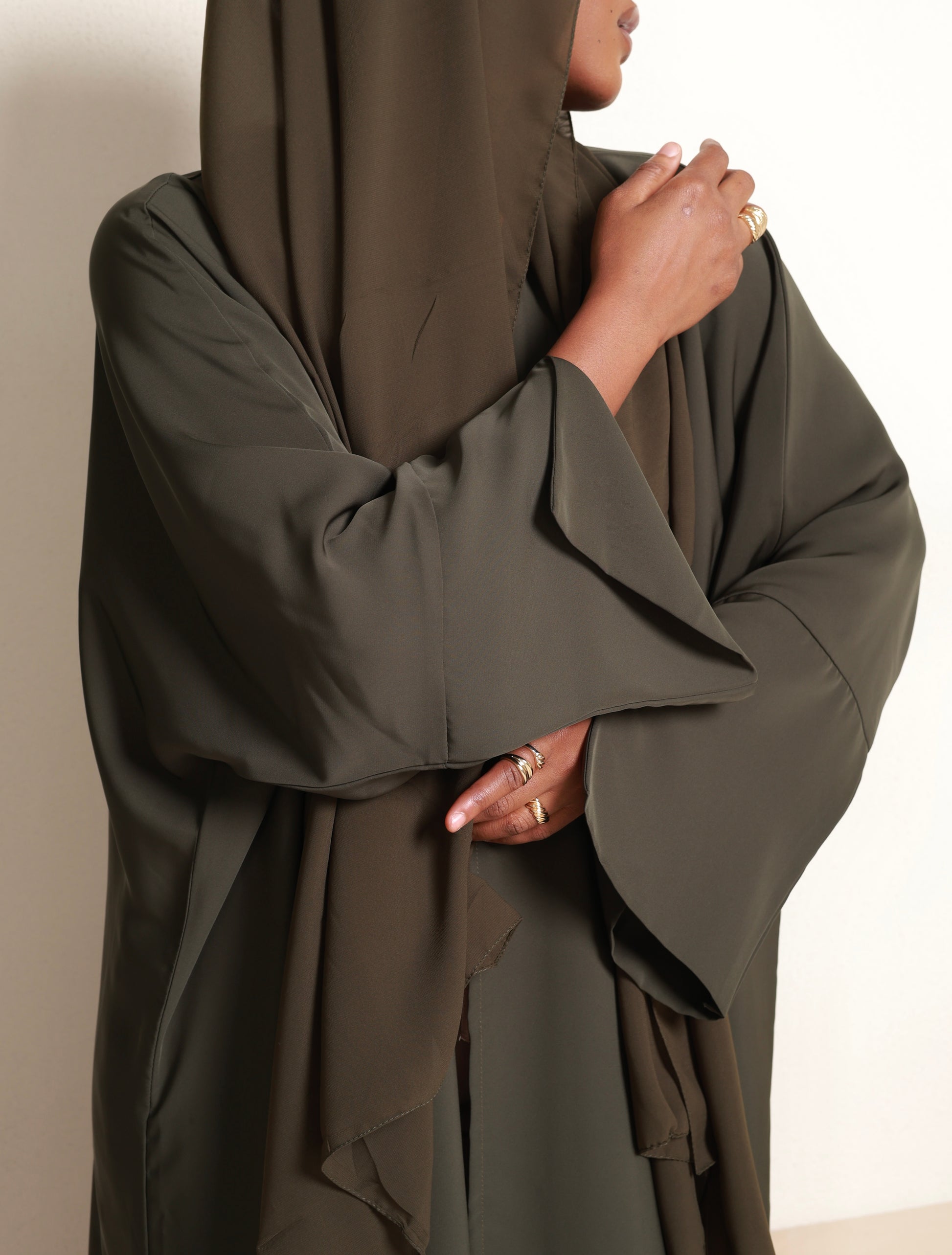 Infused with earthy richness, Olive Terra brings a grounded beauty to this abaya. Its unique blend of olive green and warm undertones creates a look that is both bold and organic. Flowing in soft Nida fabric, it celebrates natural strength and elegance, designed for the woman who walks with rooted confidence.
